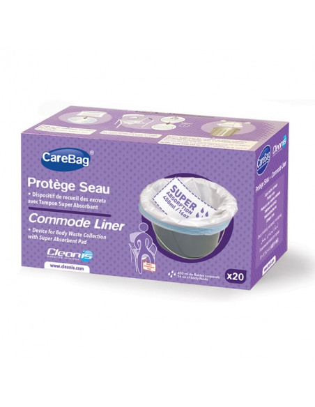 Le Protège Seau CareBag a été conçu pour s’adapter à tout seau de chaise percée standard. Au contact des fluides et des matières, le tampon agit dès le premier contact avec les liquides pour gélifier le contenu, et ainsi limiter, après fermeture, le risque de renversement et d’éclaboussures tout en emprisonnant les odeurs. Son élimination se fait avec les ordures ménagères ou en cas d’infection, avec les déchets.
